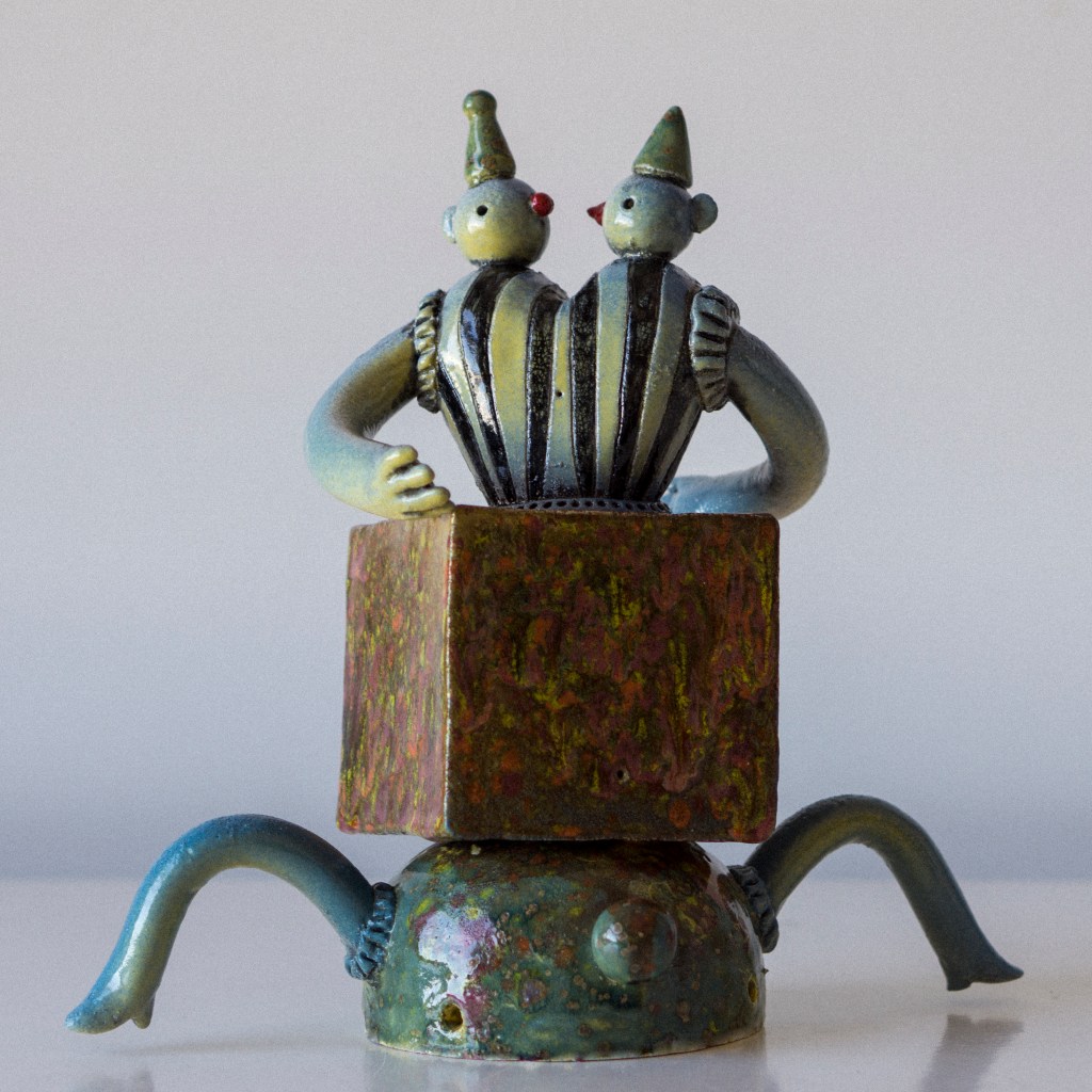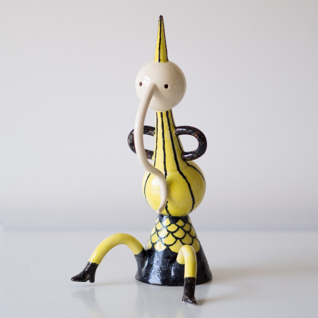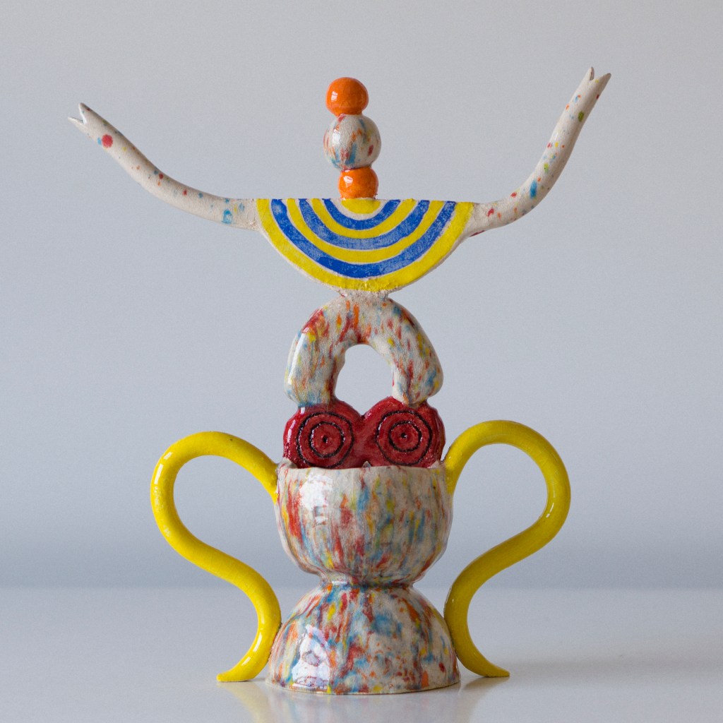 GAL. Traballo sobre a plástica do xoguete e o equilibrio entre as formas xeométricas e cores intensas, partindo de referencias do mundo da animación ou da marioneta. O que me aporta a idea do boneco é unha proximidade que me permite saltar barreiras estéticas e achegarme ao lado máis pueril da persoa que observa a obra.